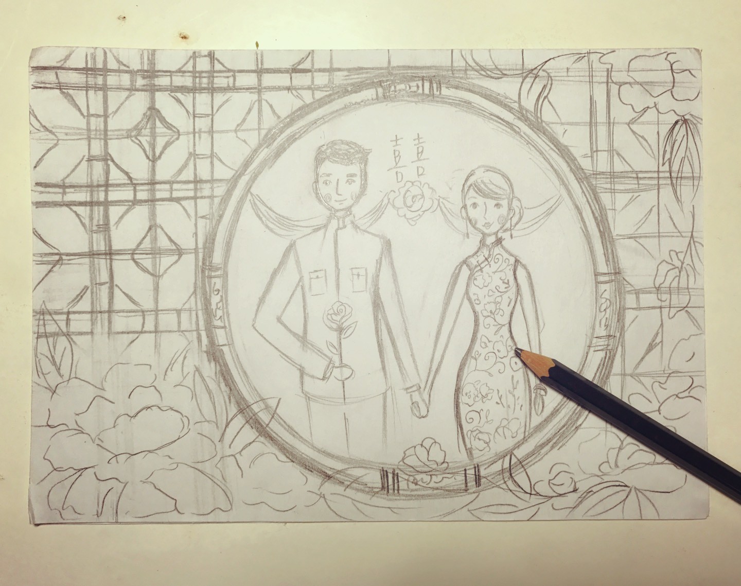也因為寶慧給的完全信任和不設限,靈感滿滿的Jubie把中式的窗櫺加上高端大氣上檔次的花中之后牡丹,穿著旗袍和中山裝的新人配上喜字和結彩,中國風元素一個都不落地!草圖就此登場啦~(敲羅打鼓)