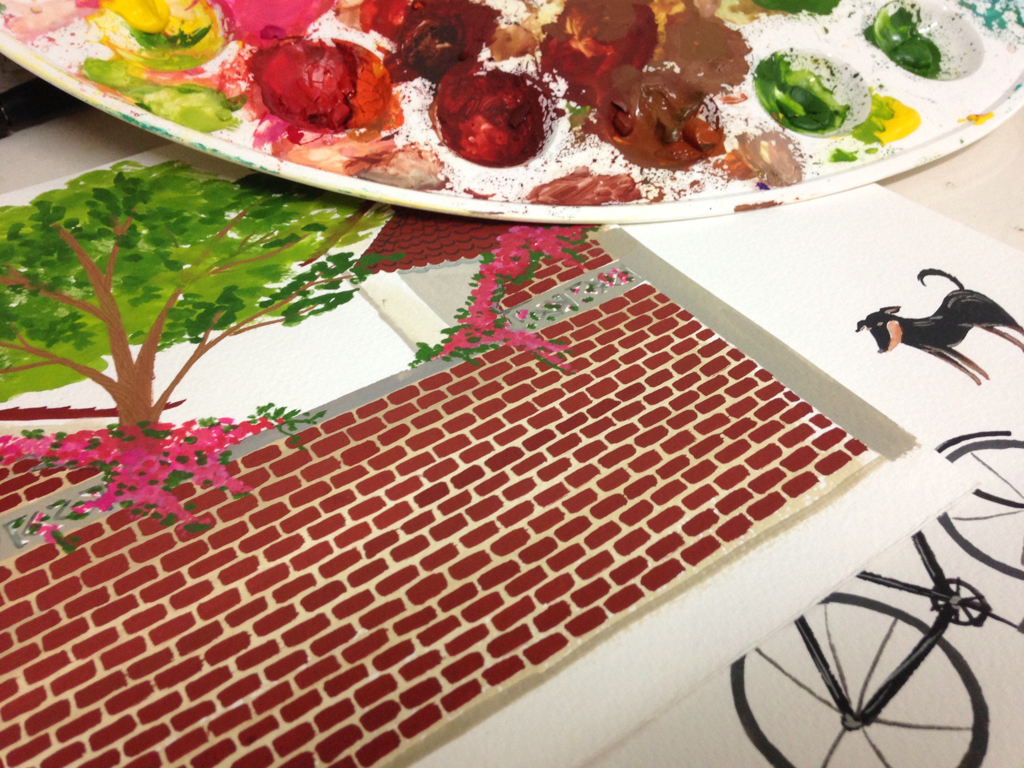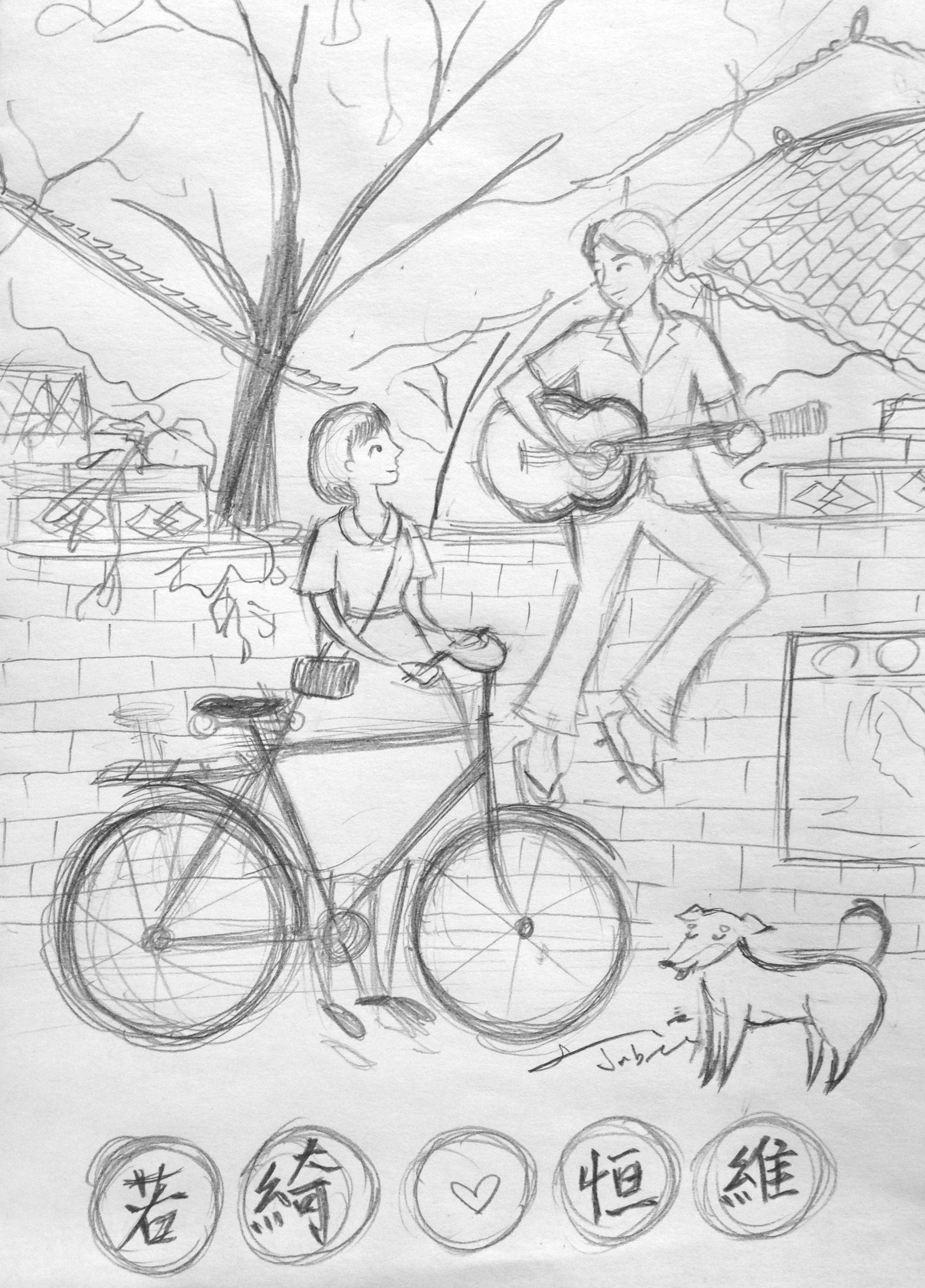 後來,就在5月初的時候我們拿到了『好看到很恐怖』的完稿圖?那一面記憶中的紅磚矮牆,還有攀在上頭的紫紅色九重葛全都完美呈現,旁邊掛著的電影看板是來自啾比的巧思。畫面中的我們相視而笑地對望著,復古腳踏車拖著它的影子一同延伸呼應我們的婚紗照,以及我們的老寶貝NO.9?也帥氣地搖著尾巴哈哈笑著。