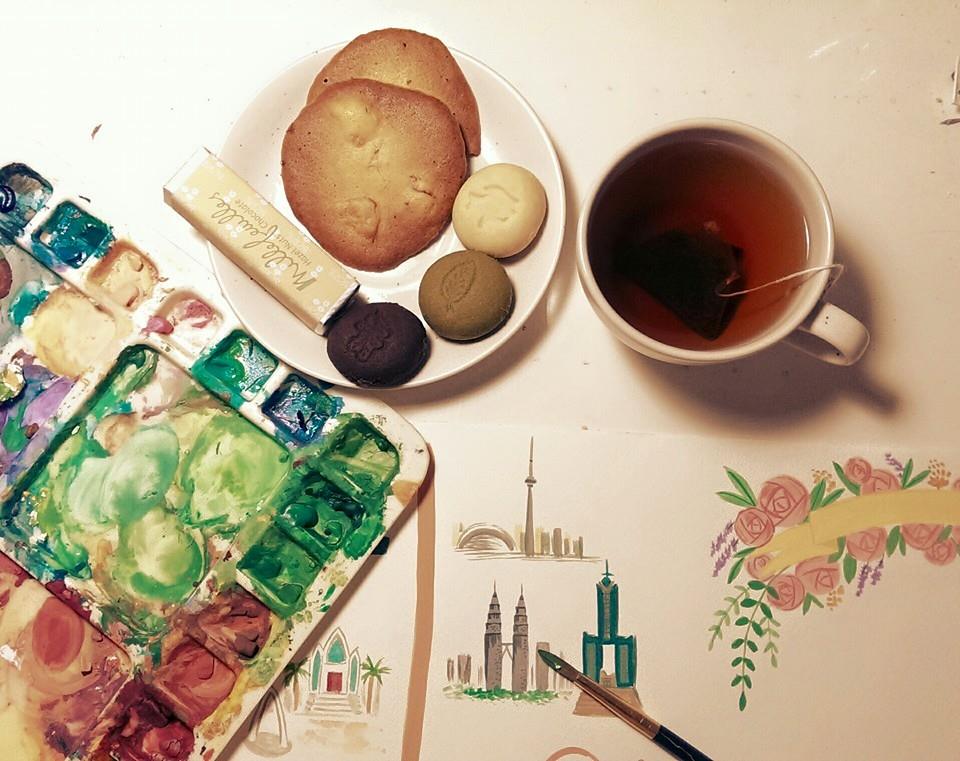 手繪上色的時候,正巧吃著之前新人送來的喜餅!Jubie心裡暖啊~~當然更有動力的用水彩,一筆一劃的勾勒出兩人生活城市的地標!