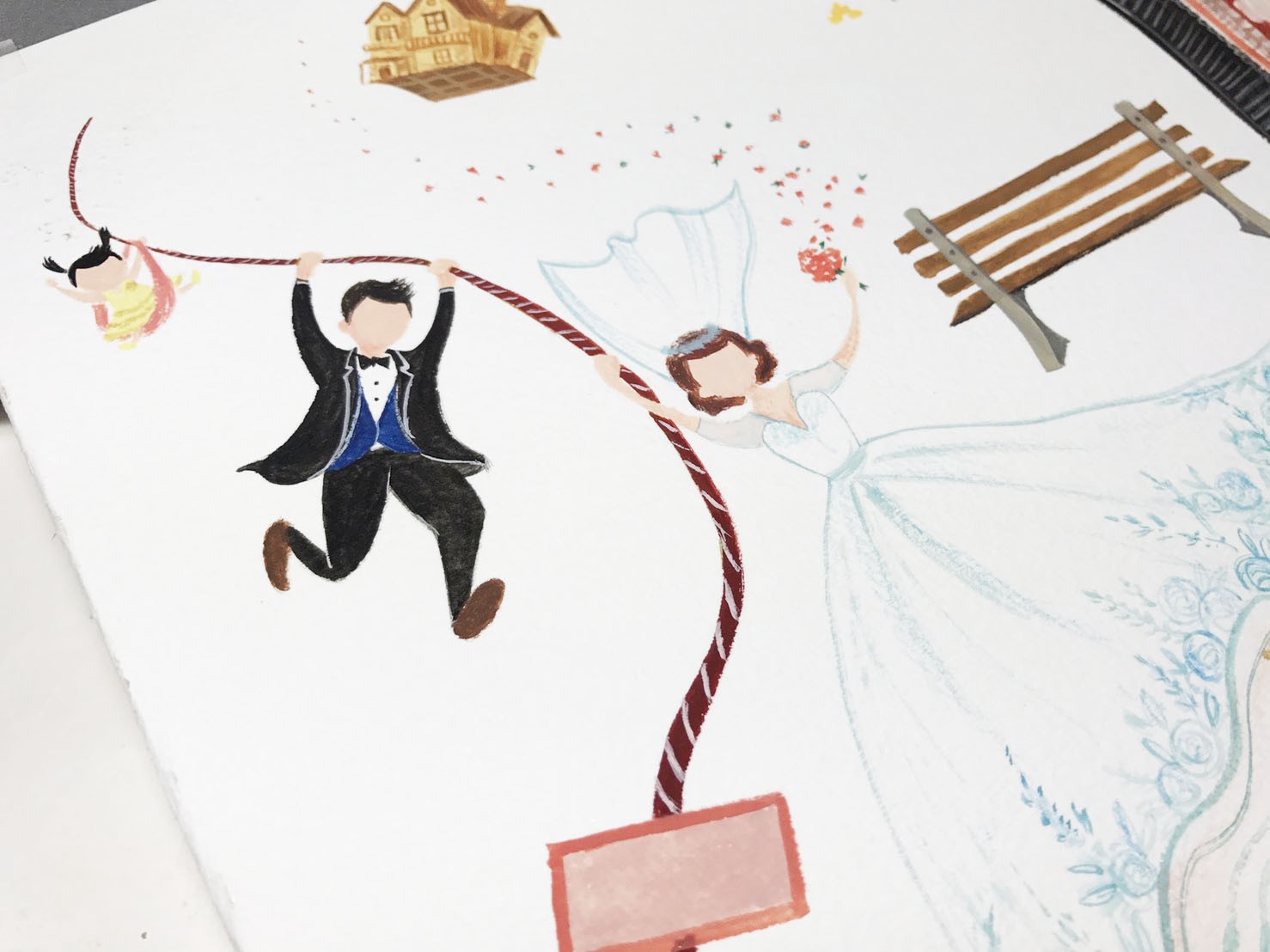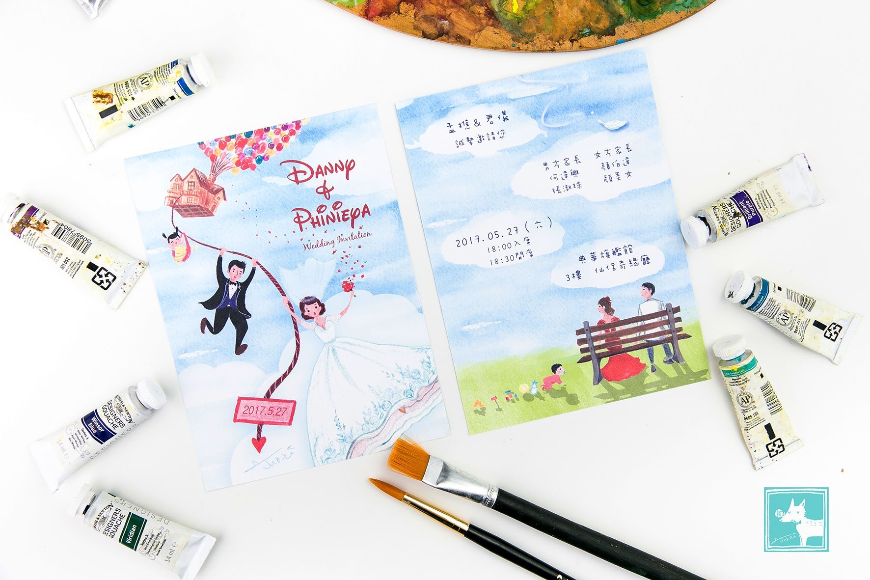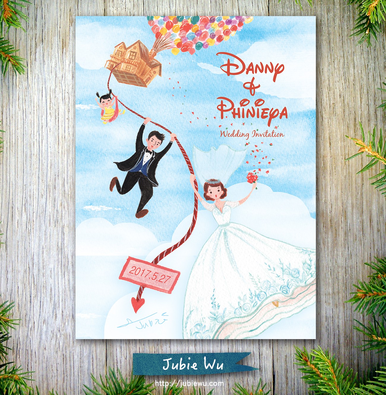 感謝新人親友的肯定和介紹,雖然一開始對於要畫什麼主題有各種的糾結,但在討論過後,我們決定用皮克斯電影海報的概念去繪製喜帖。在創作過程中,我發現新人們非常有創意和熱情。繽紛的氣球屋連結了夢想、愛情、希望,將一生摯愛都緊緊聯繫,一起在蔚藍晴空中自在遨翔……這樣的感覺讓我深深感動,最後成品得到了新人和親友滿滿的驚呼和讚賞。Jubie對於這份特別的喜帖也非常喜歡,因為跳脫了傳統喜帖的形式和概念,所以特別有意義!很榮幸Danny和Phinieya給我機會來繪製皮克斯風格的婚卡,就以這份喜帖來獻上對甜蜜小家庭最真誠的祝福囉!