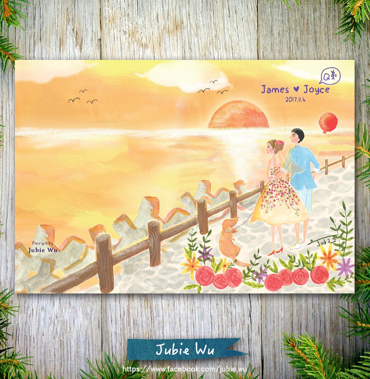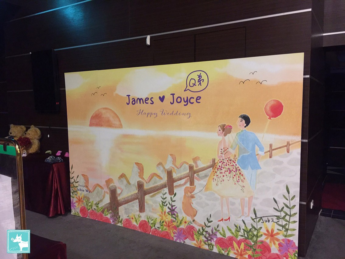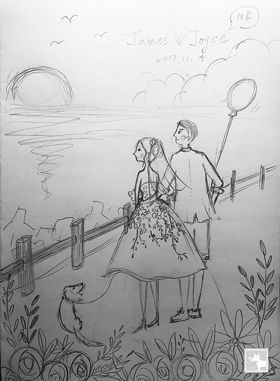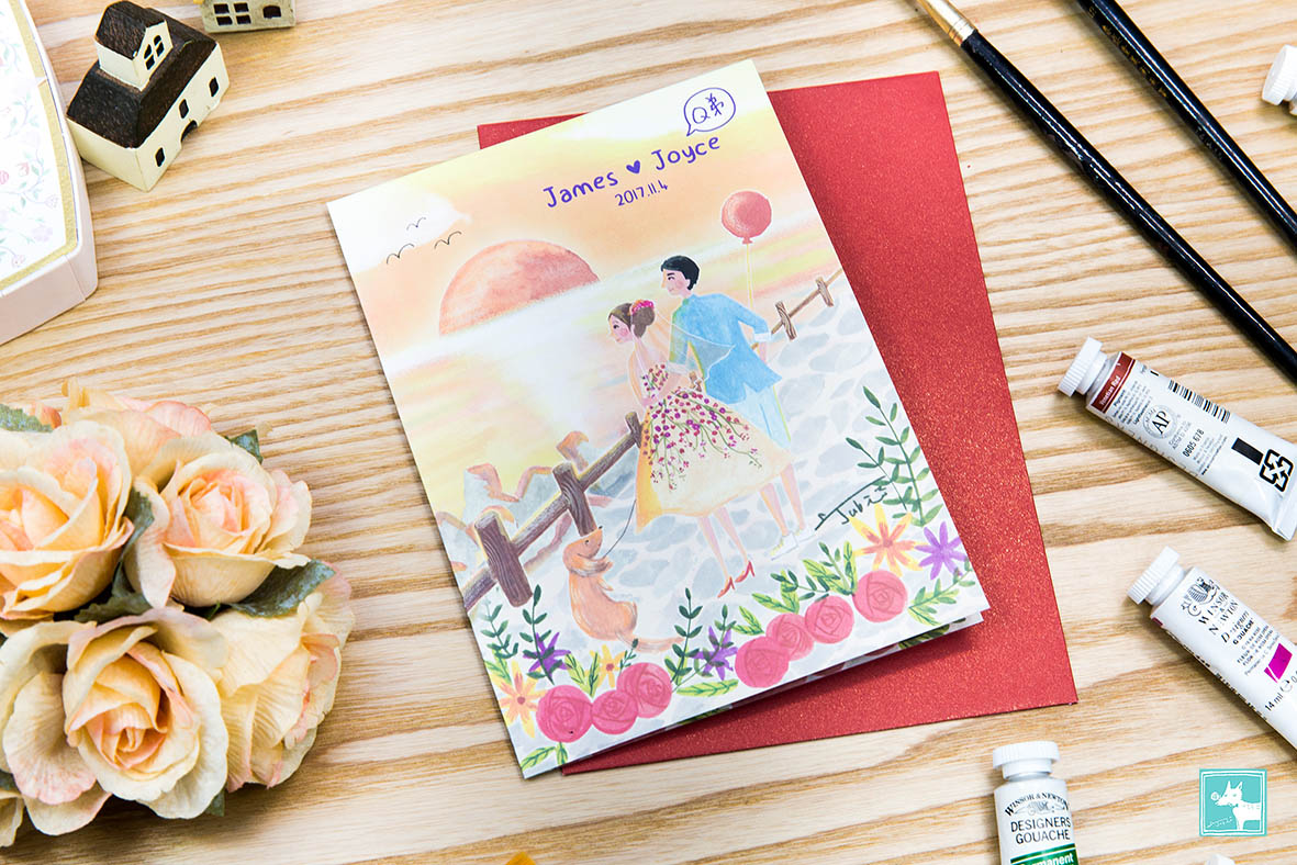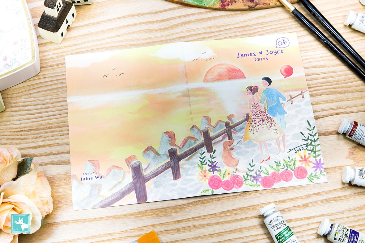 這對可愛新人的主題非常特別,傳統上在婚禮的設計上不太用夕陽落日, 但是他們選了南寮魚港的夕陽當主題,反而格外特別閒適愜意。搭配著他們可愛的狗狗Q弟,穿著俏麗婚紗的新娘,畫著畫著覺得有一種歲月靜好的感覺,暖上心頭!而且喜帖當成背板也非常吸引人,婚禮過後,新人還將背板搬回家貼在牆上裝飾喔!