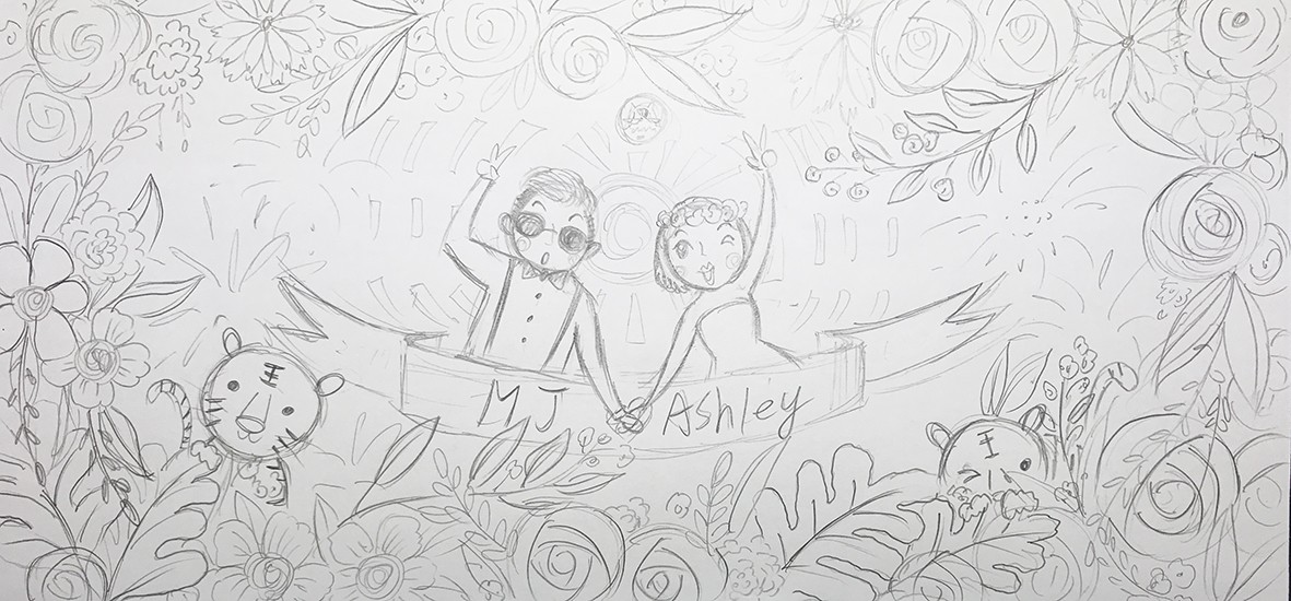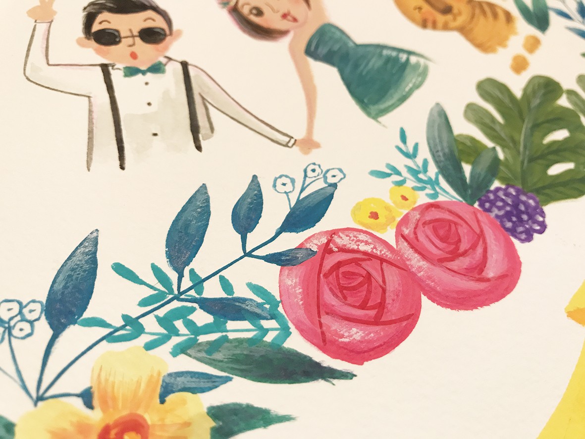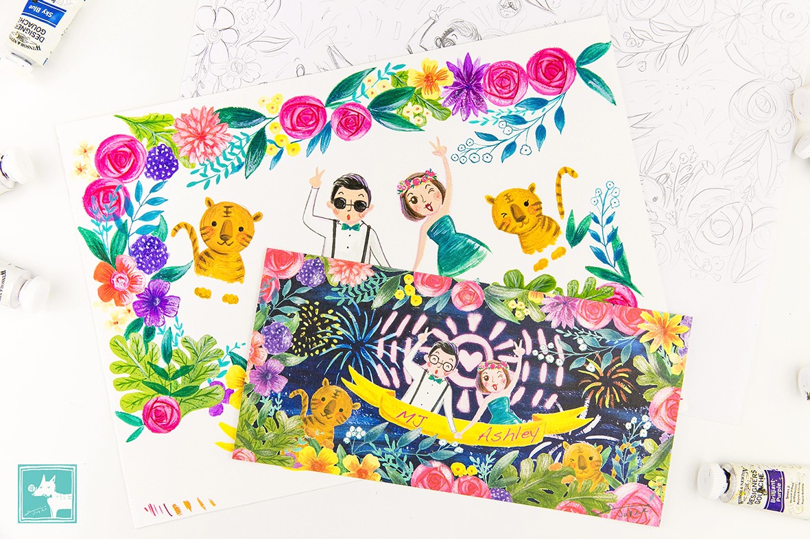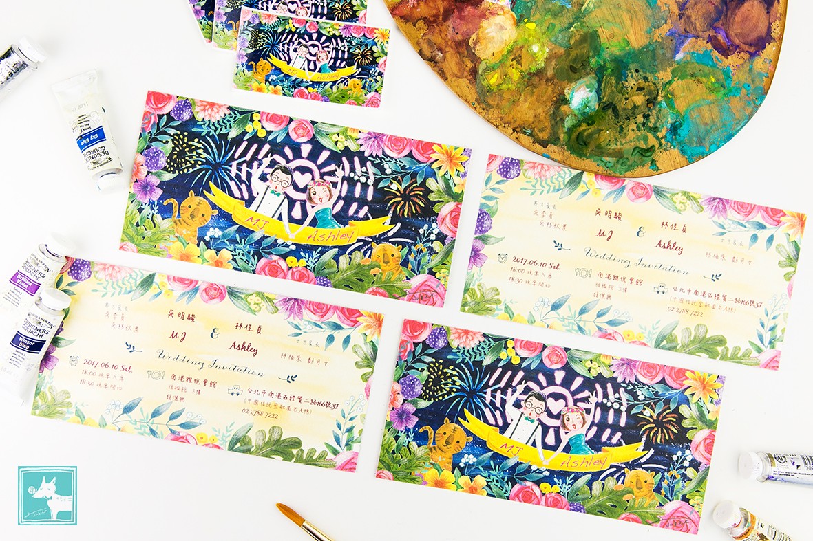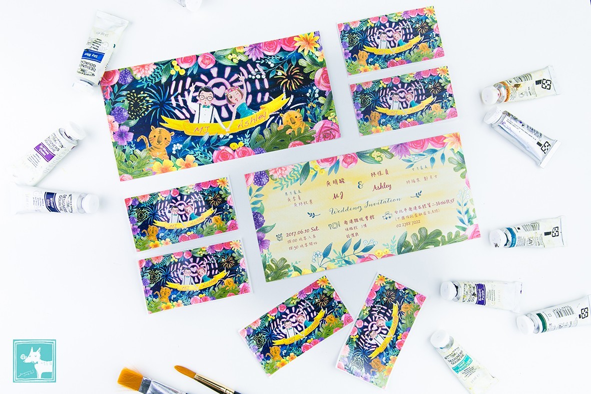 歡樂熱鬧的電音趴踢氛圍在草圖中就已經可以明確感受到了呢!加上星空煙火、繽紛花朵,還有代表兩人生肖的兩隻小老虎,新人的手牽手比出勝利手勢,是一幅風格非常獨特的喜帖喔!