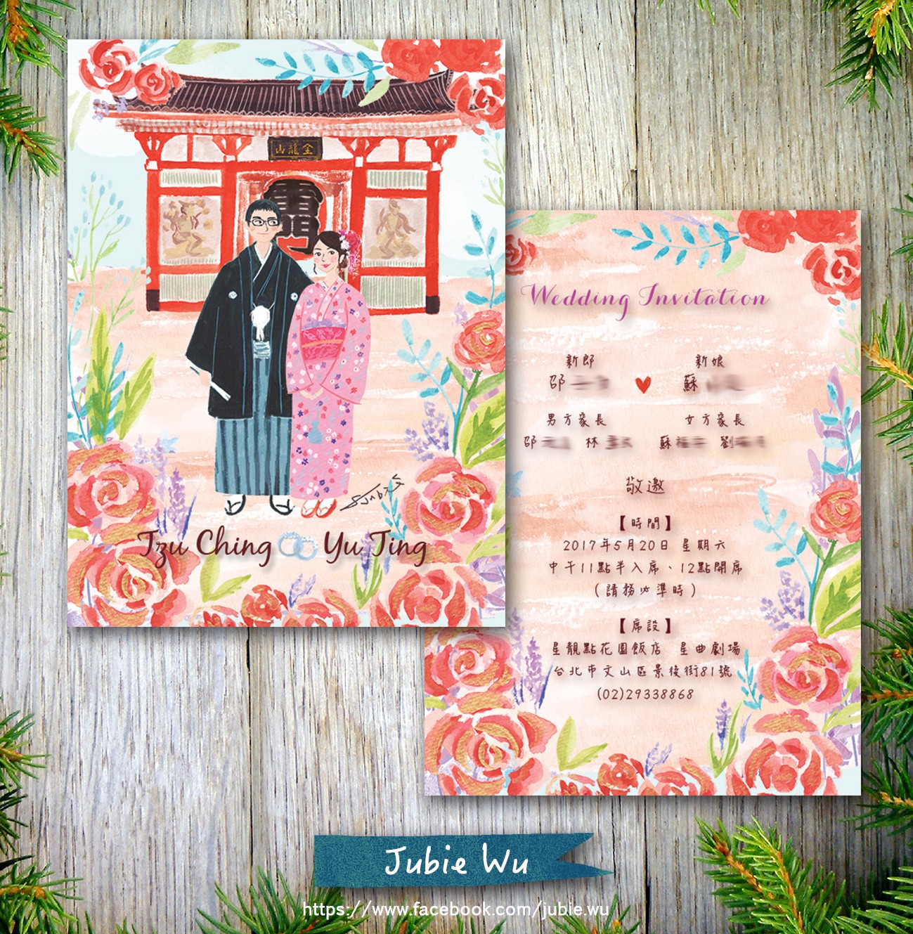 真的謝謝子勍跟妤庭,這份喜帖從設計到完稿,我都非常的愉快!除了可以畫到很不一樣的服裝和主題之外,可愛又親切的兩人更是給我非常大的空間也完全的信任我,因此不管在服裝、場景以及花邊的安排,都讓我畫得非常自在!我相信大家看到畫面也可以感受到吧~是一份雖然看似簡單,但我真的很用心在每個細節的繪製,因此也讓我非常難忘的喜帖!一切一切,都非常喜歡~