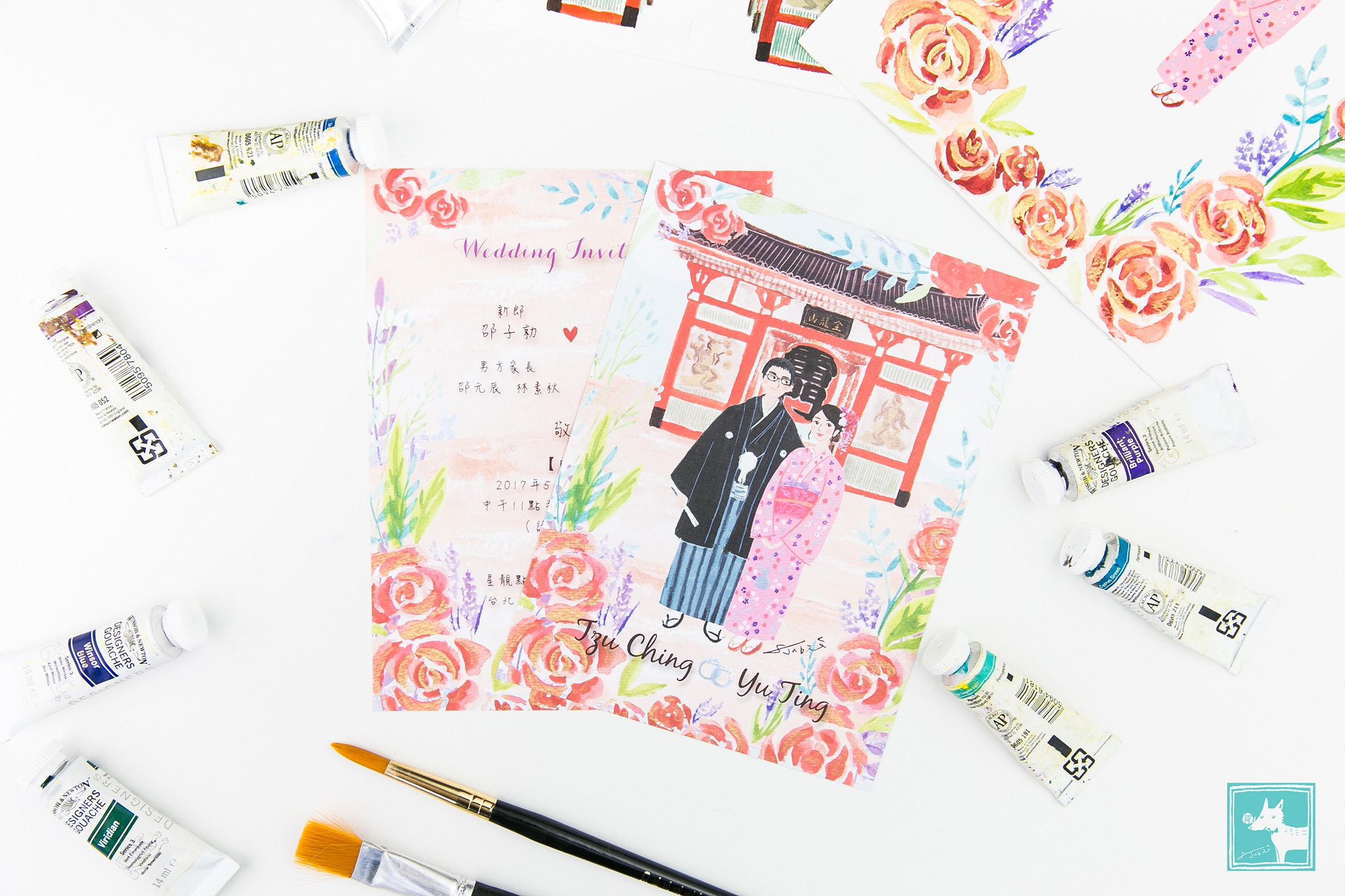 很快地與Jubie見面討論喜帖的內容,因為老公是標準的日本迷,堅持整個畫面要有日本的感覺,就選擇了第一次我們到日本旅遊去過的地方,也是大家熟知的雷門作為喜帖的背景,並配合我們婚禮的主色系與主視覺,加入了Tiffany藍的色調與浪漫的玫瑰花,從最初的草稿到上色後的完稿,Jubie一直都很有耐心的詢問我們的意見,哪裡是否需要修改,最後在Jubie的巧手下畫出了一張毫無違和感的喜帖,也把我們所希望的感覺完整呈現。