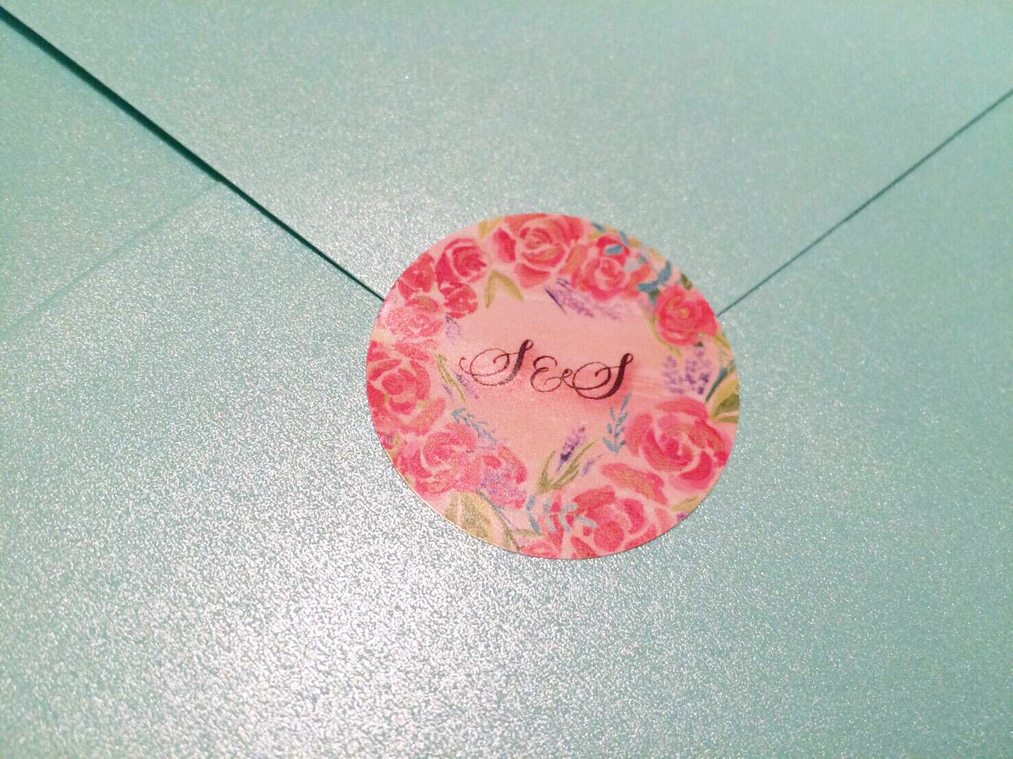 除了喜帖~兩人的貼紙也是特製的喲!玫瑰花邊配上兩人的英文縮寫,一整套搭配不同顏色的信封都非常適合!超級有誠意!
