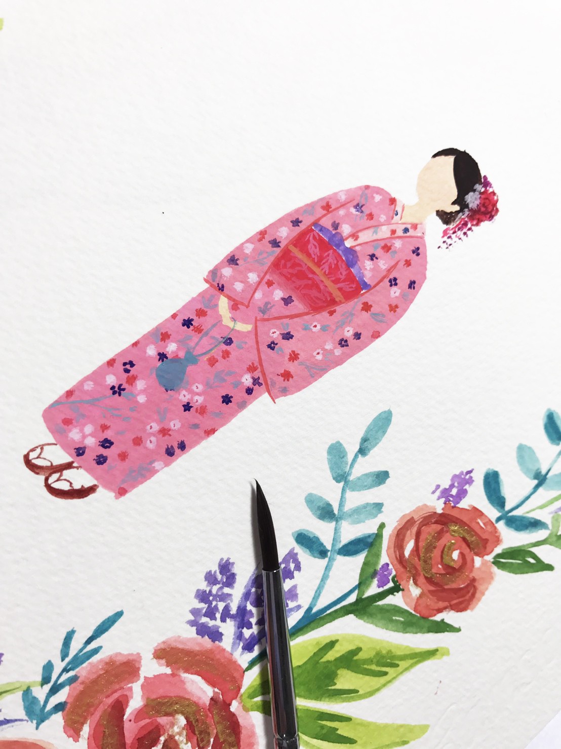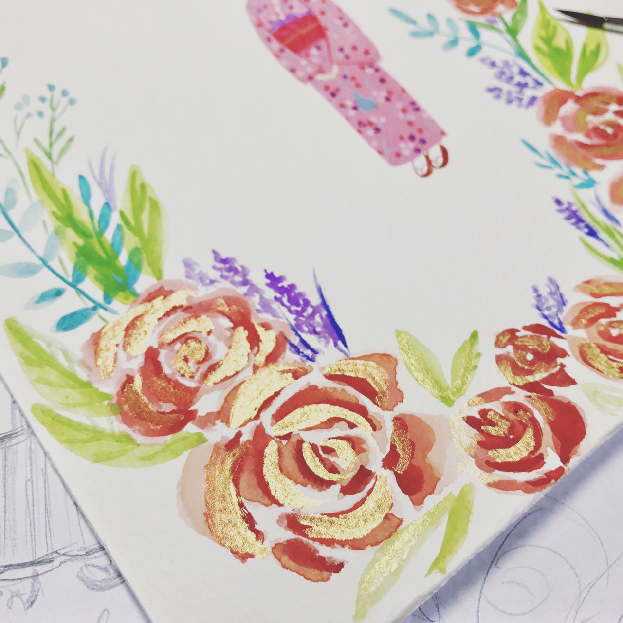 新娘喜歡浪漫的玫瑰包圍的感覺,於是在水彩上色的過程,Jubie便特別用了紅色水彩顏料渲染和堆疊出玫瑰花圈,以及金色的顏料點綴在花瓣上,原稿看起來就像是金色的玫瑰,非常浪漫!