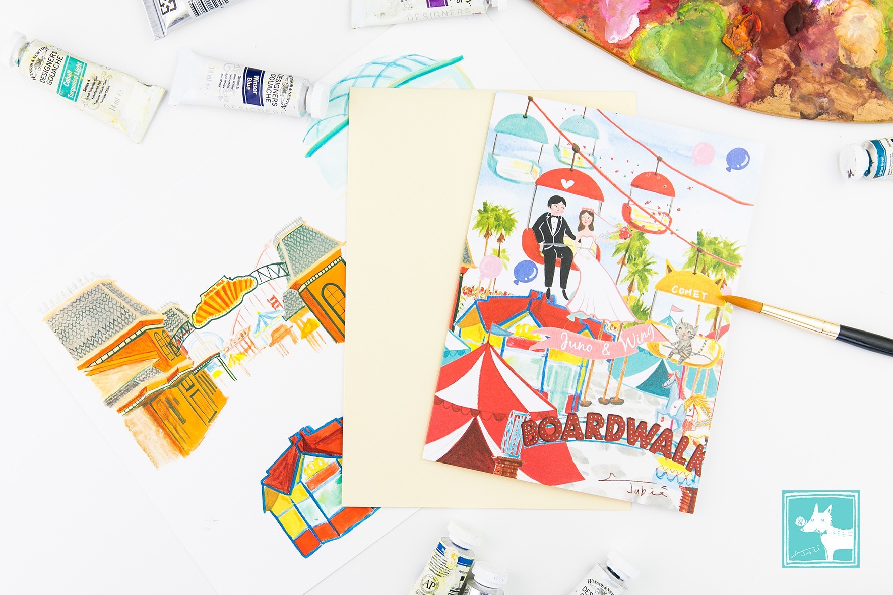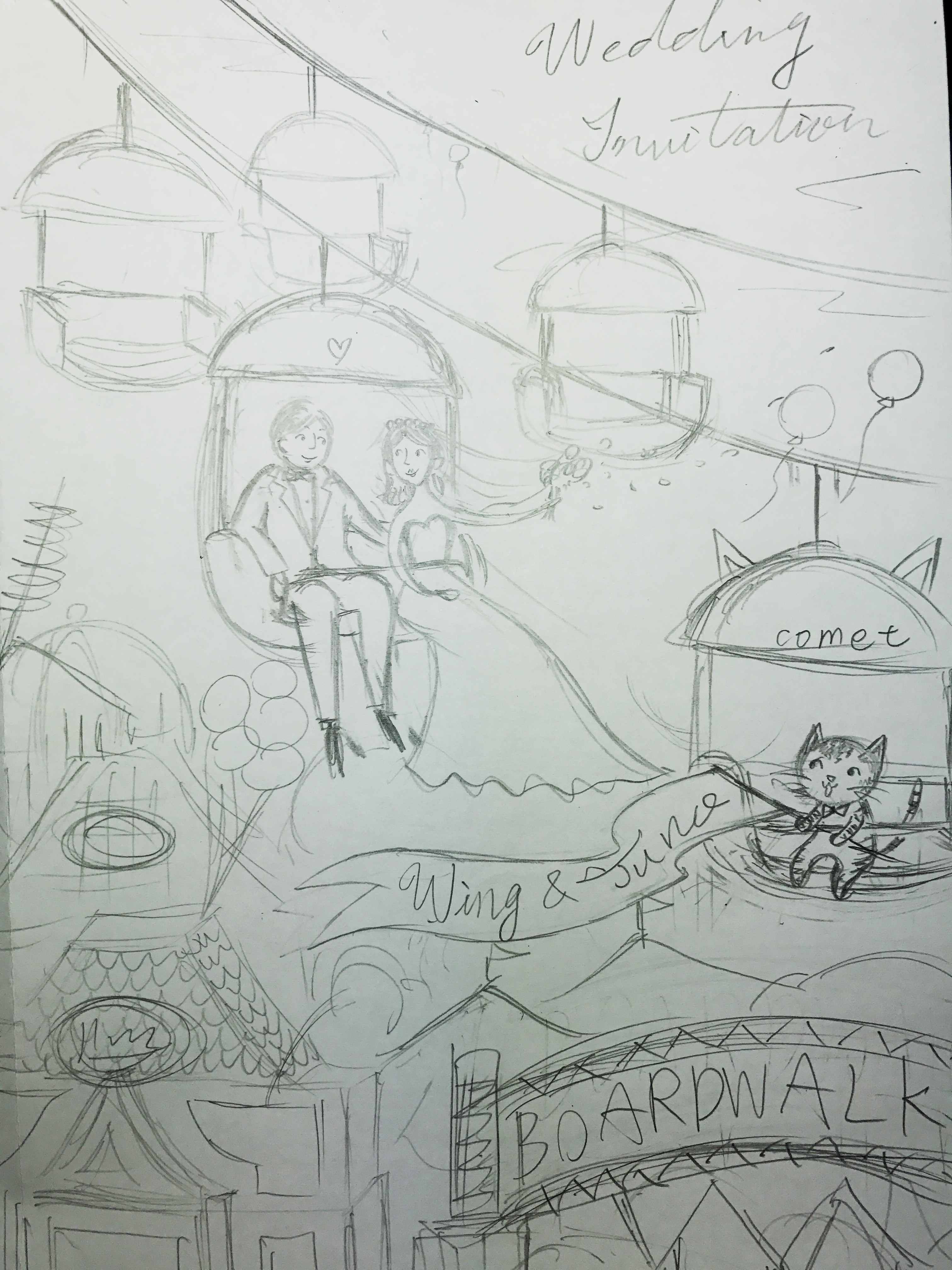這對新人是住在美國的香港人,Jubie非常榮幸能為這對小夫妻繪製他們的愛情記憶。在他們的印象中,空中纜車和椰子樹是這個海灘遊樂園的特色,而Jubie家裡的貓咪Comet搖著寫著兩人名字的幸福旗幟,可愛的模樣也讓新人非常喜愛!最讓Jubie人感動的是:兩人在婚前一年多以前就已經下訂了。儘管新人在國外,不像台灣客戶可以很直接聯繫,但是雙方溝通過程非常順利。尤其在忙碌的籌備婚禮期中,用心的新人還能將資料準備得十分充足,而且相當尊重專業,從~頭~到~尾都沒有改動過Jubie的設計。有這樣高度的信任感,合作過程當然非常愉快囉,所以讓Jubie在作畫時一直保持雀躍的好心情呢!