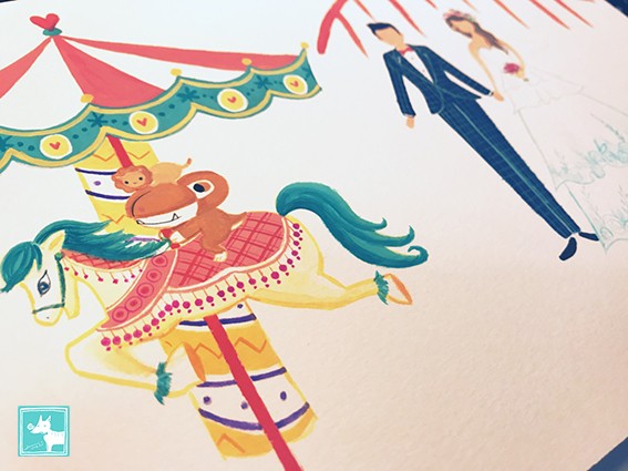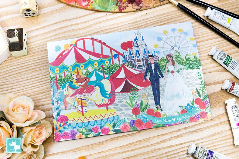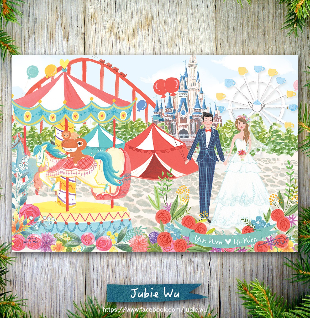 這對新人超級有趣XD喜歡遊樂園的感覺,又想把自己的恐龍還有獅子娃娃放上去~於是就有這幅有趣卻一點也不違和的喜帖誕生!新娘就像朋友一樣,會常常跟我分享大小事,所以連恐龍我畫起來都特別親切~而且圖樣一出來變超級順利的定稿完稿,工作群組的氣氛歡樂得就真的像是遊樂園啊!(瞧瞧恐龍本尊是不是又帥氣又可愛!)