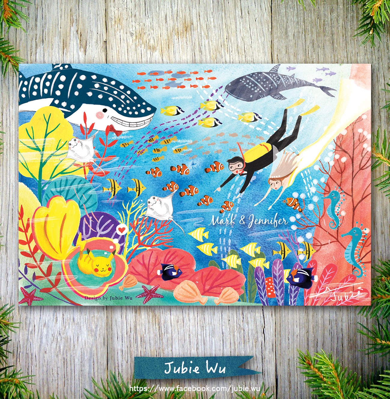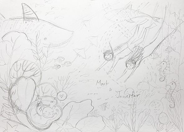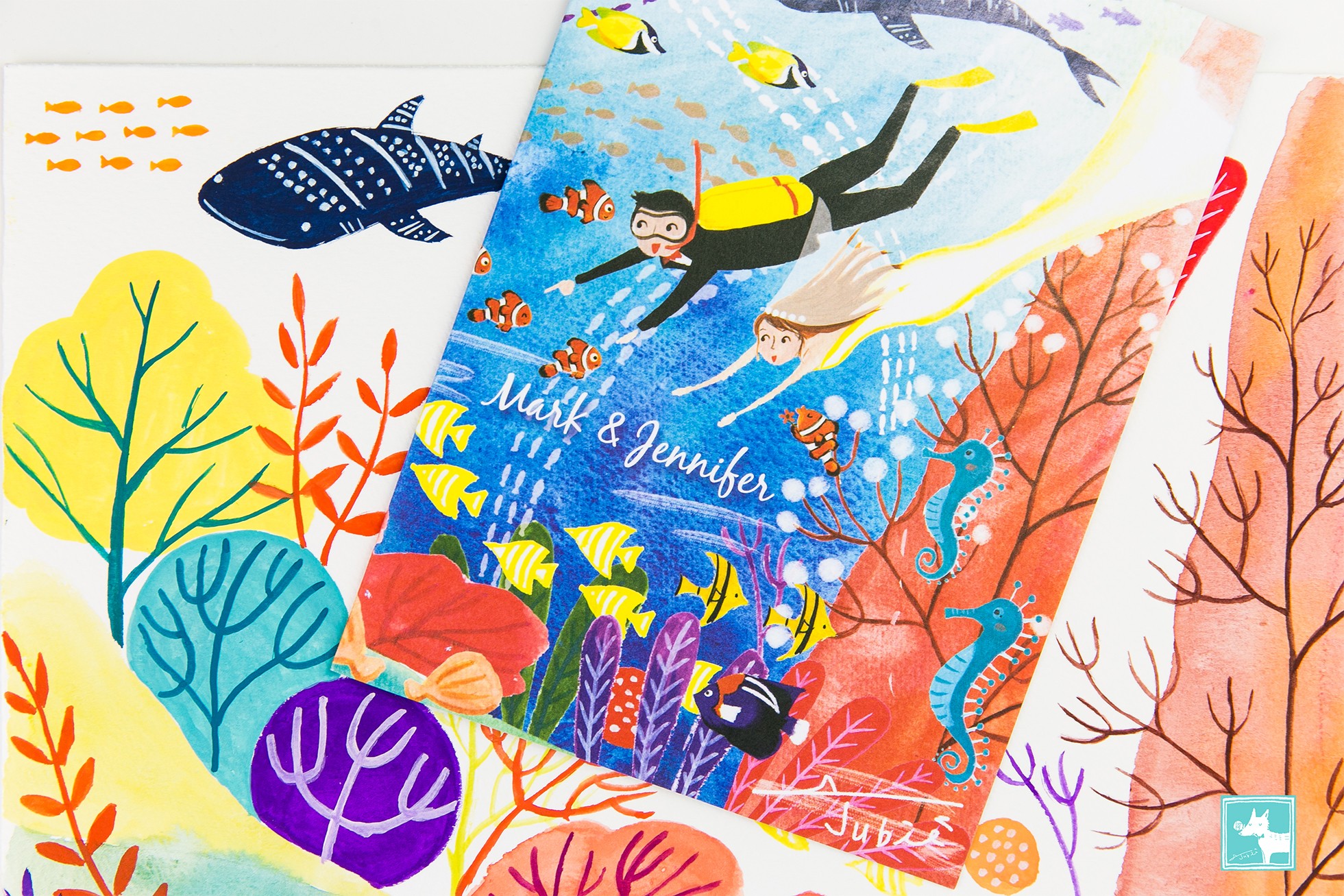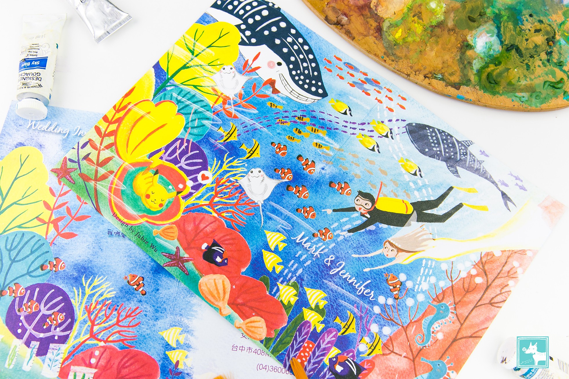 非常喜歡藍色大海的我,畫這幅喜帖的時候是又期待又怕受傷害的感覺XD因為終於有難得的主題可以發揮(雖然之前也有畫過海底世界,但是這次想要更有突破!)卻也擔心是不是我的想法新人不一定能接受,但是這對可愛的新人給了我非常大的發揮空間,要怎麼潛要怎麼編排都讓我自由創作,所以我就大膽的嘗試了以前沒有嘗試過的設計,於是可愛的海底世界喜帖華麗麗的誕生了!我也非常喜歡呢!!