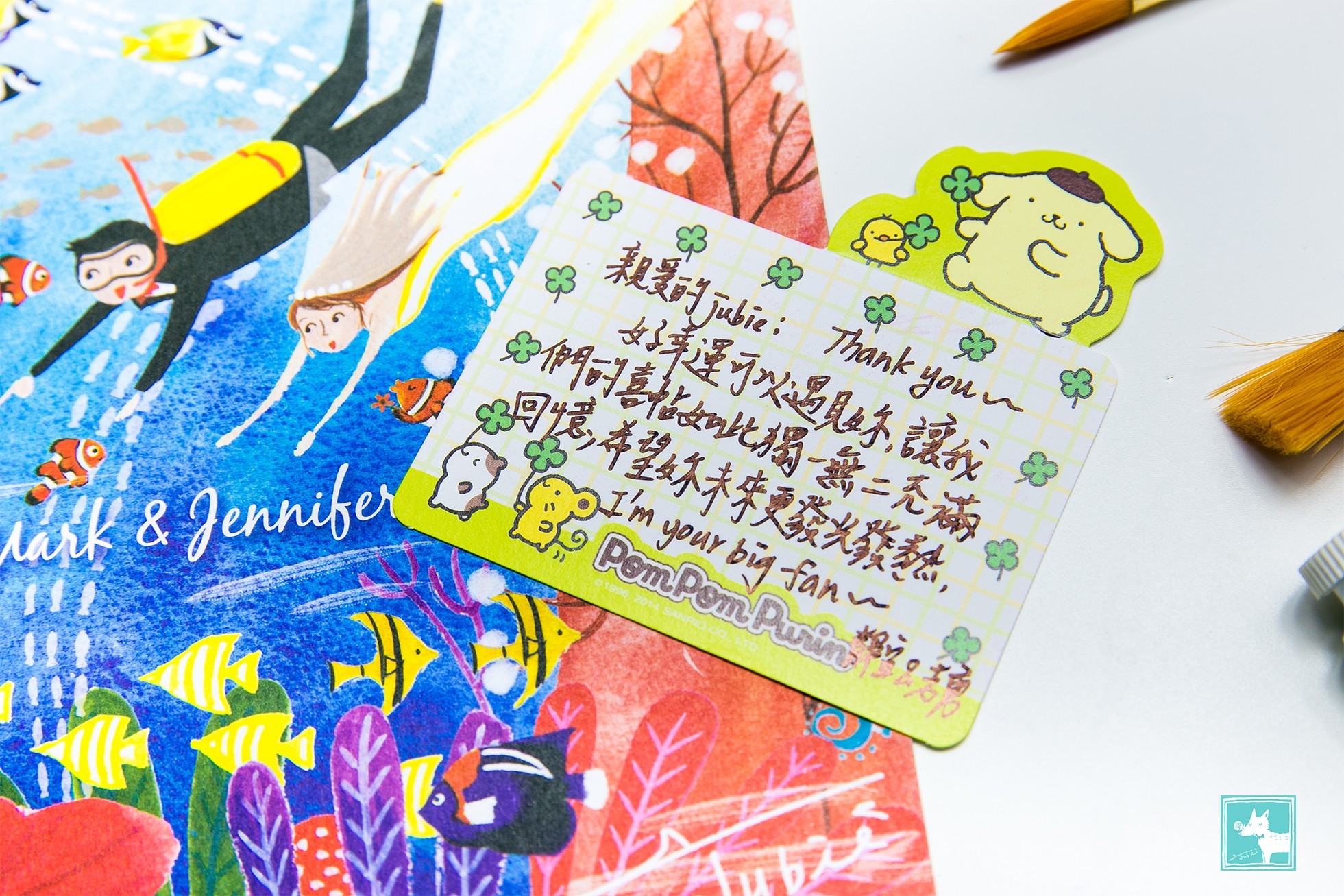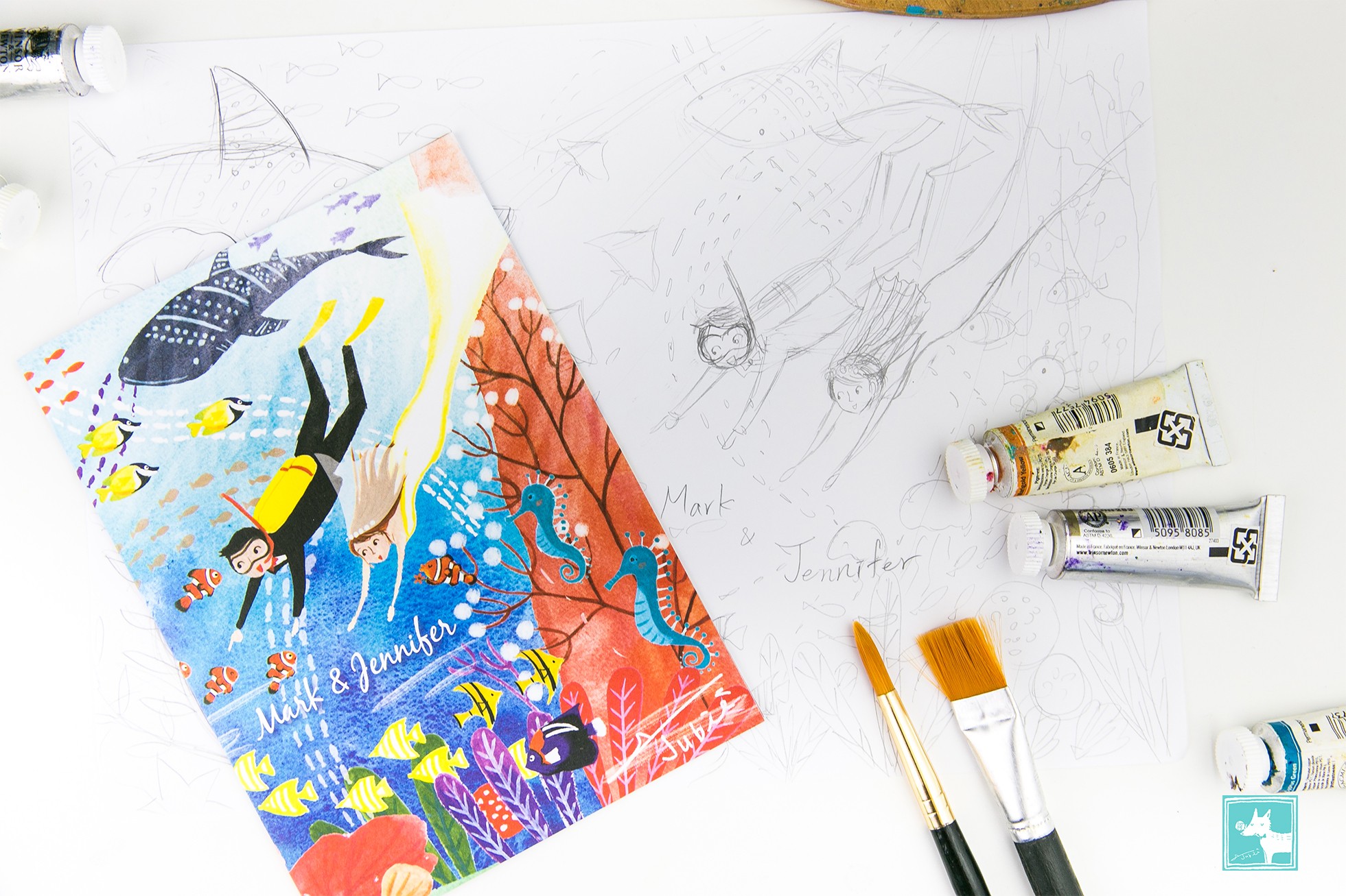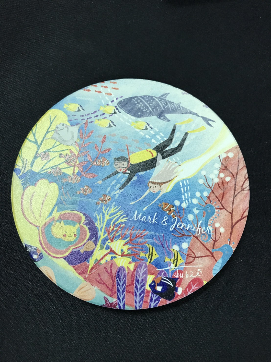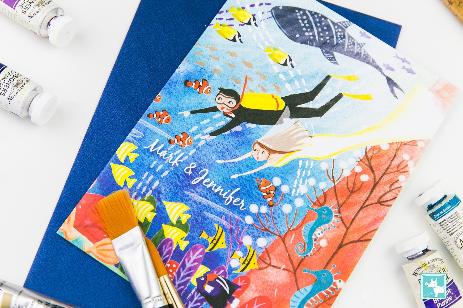 非常喜歡藍色大海的我,畫這幅喜帖的時候是又期待又怕受傷害的感覺XD因為終於有難得的主題可以發揮(雖然之前也有畫過海底世界,但是這次想要更有突破!)卻也擔心是不是我的想法新人不一定能接受,但是這對可愛的新人給了我非常大的發揮空間,要怎麼潛要怎麼編排都讓我自由創作,所以我就大膽的嘗試了以前沒有嘗試過的設計,於是可愛的海底世界喜帖華麗麗的誕生了!我也非常喜歡呢!!