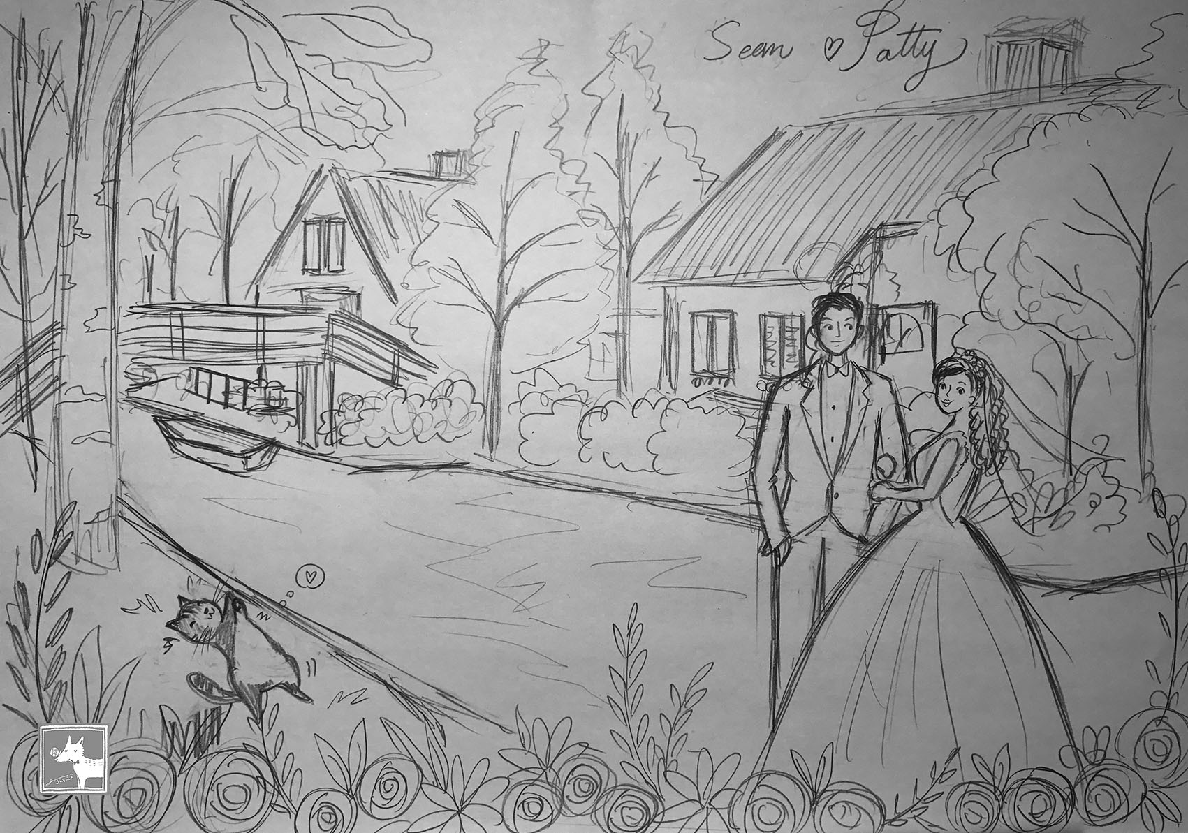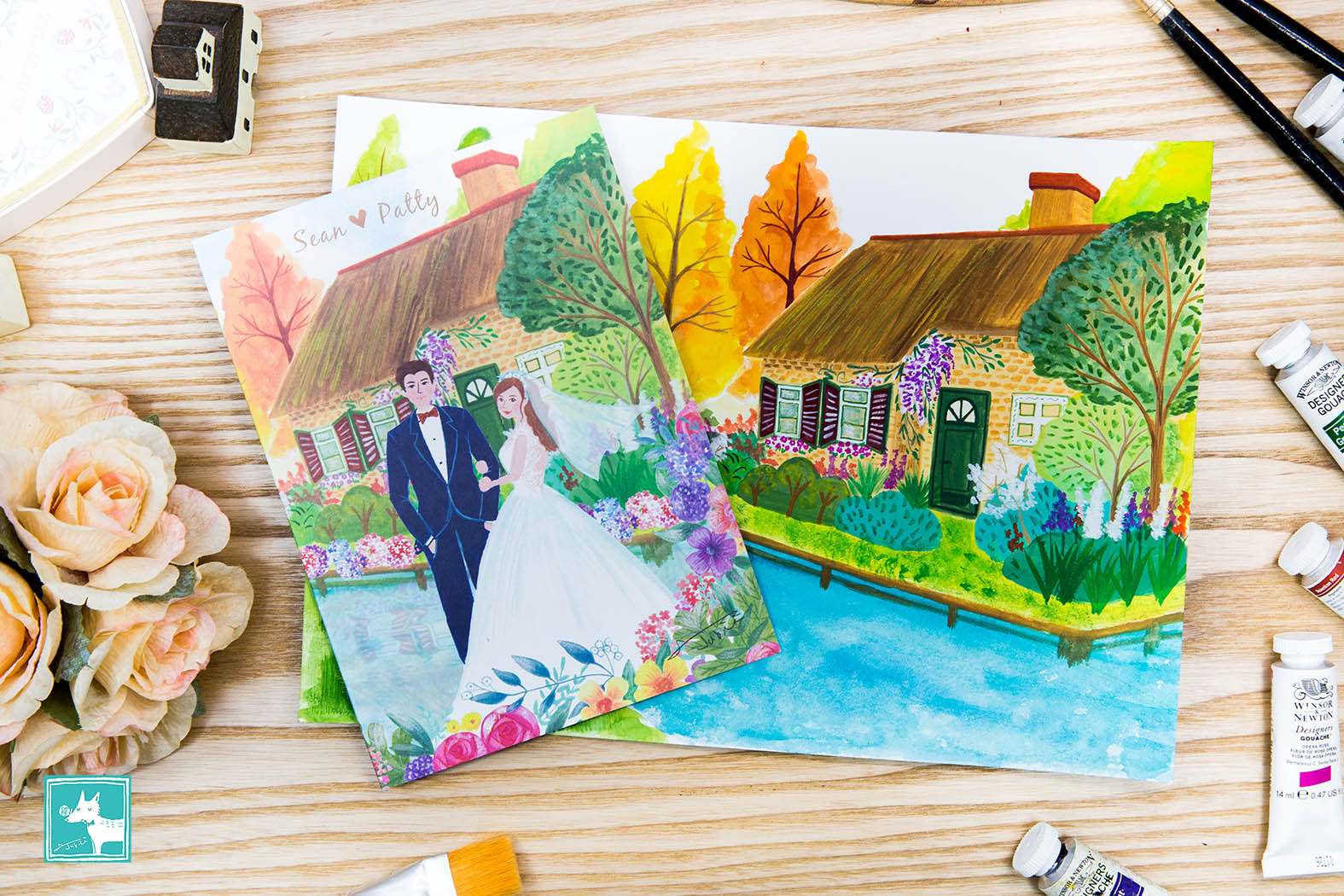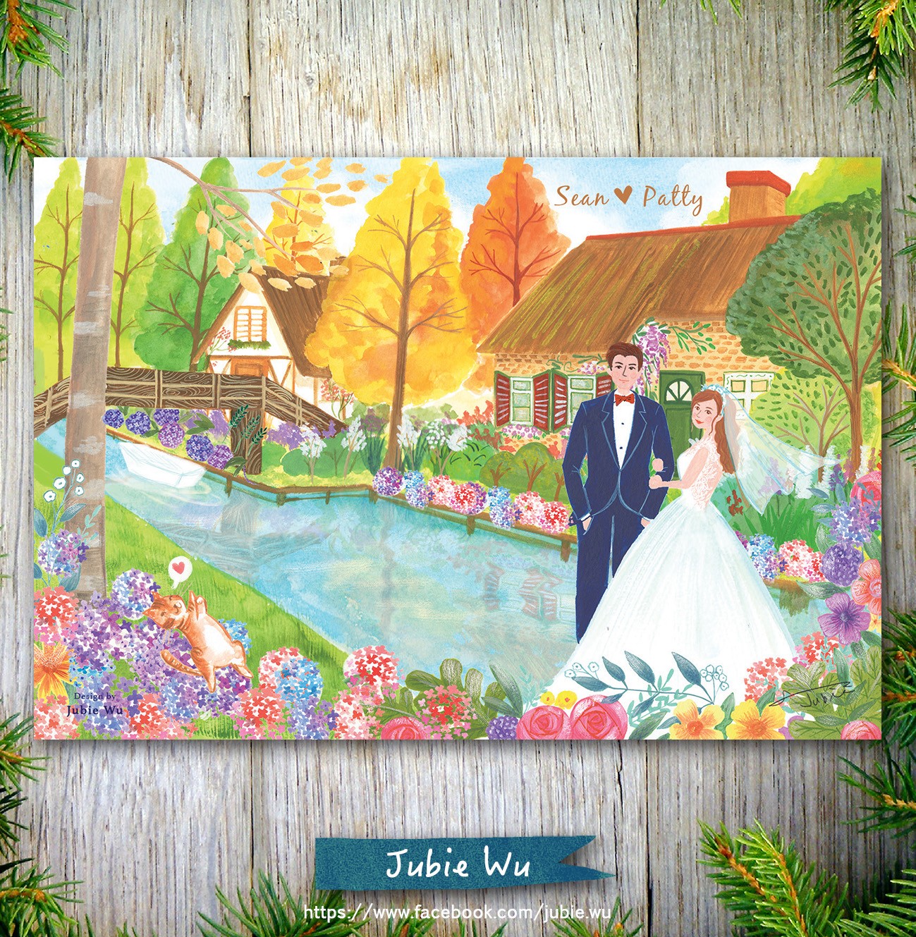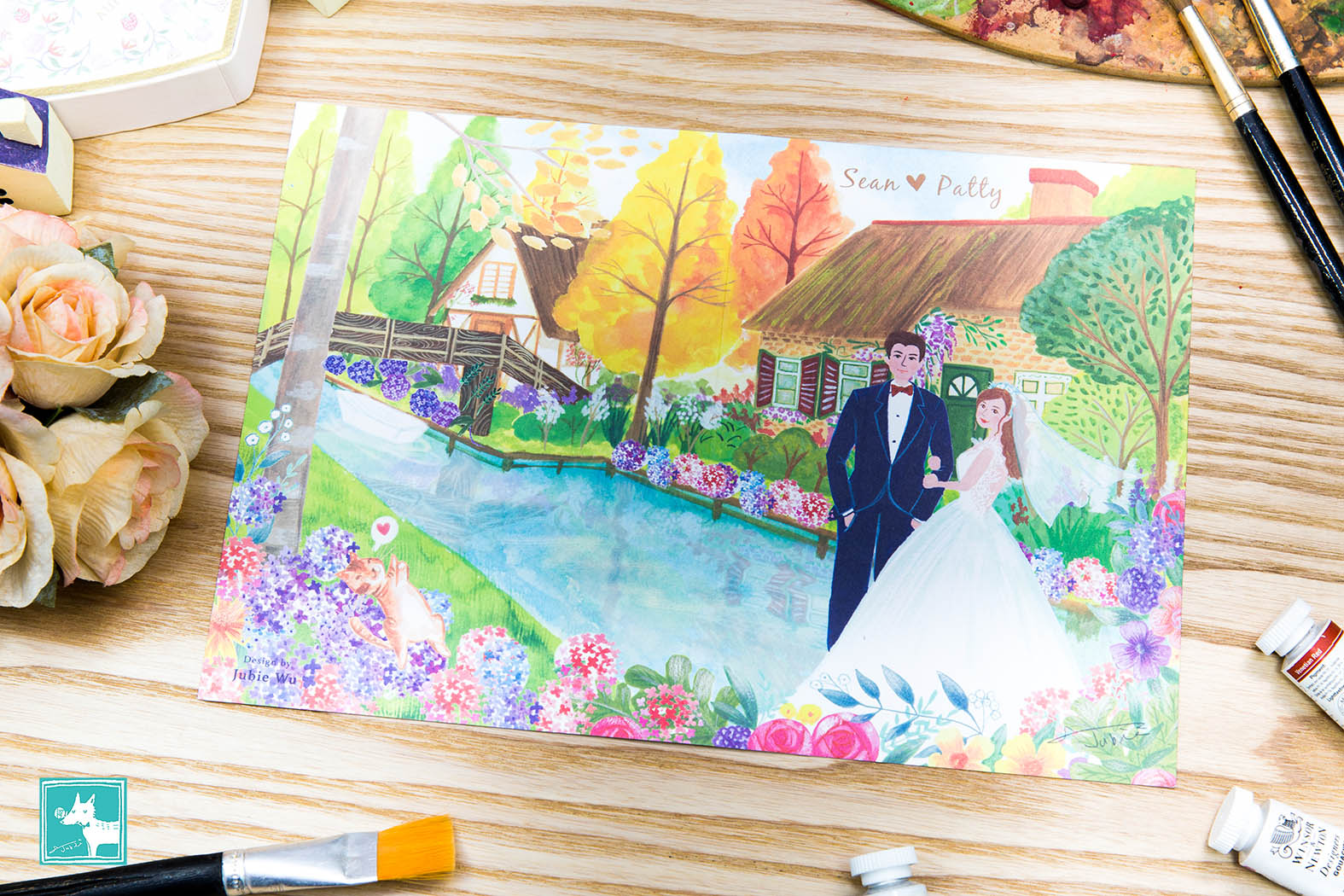 這對寶貝新人非常非常可愛,新郎是雲南人,而且兩人都在新加坡工作,他們卻能夠和Jubie遠端連線,聊天聊得超級投緣。回台灣之後,新人還來到工作室跟Jubie喝下午茶,繼續大聊視訊聊不夠的話題呢!Jubie還收到他們超好吃的喜餅,讓人覺得當一個被新人寵愛的插畫家,也實在太幸福了啊!雖然不是第一次畫羊角村,但這次Jubie採取了全景視角,透過流水倒影創造延伸感,將小屋,小橋,樹木,以及在草地上跳躍玩耍的可愛貓咪,都放在最適合的位置。全幅喜帖畫起來實在非常過癮,Jubie自己也超級喜歡這幅作品呢!真心感謝並祝福這對寶貝新人,婚後的每一天都過得像在羊角村牽手散步的日子,一樣甜蜜愜意喔!